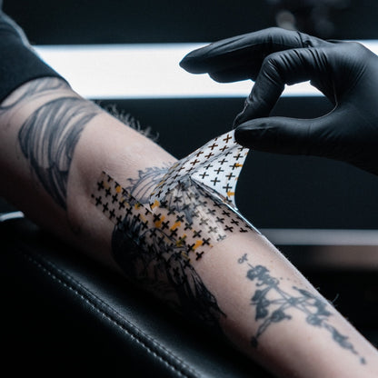 Effortlessly protect your new tattoos with Recovery Derm Shield, a latex-free transparent matte film adhesive bandage. Derm Shield offers maximum breathability and flexibility, providing optimal conditions for flawless, gentle healing and skin renewal. It eliminates scabbing and reduces the risk of scarring, while preventing exposure to bacteria, dirt, and abrasion. Derm Shield is waterproof, but permeable to allow skin perspiration, and it is durable enough to keep up with your everyday activities with a peace of mind and body. Preserving tattoo vibrancy, our Derm Shield allows your skin to breathe and heal the right way.